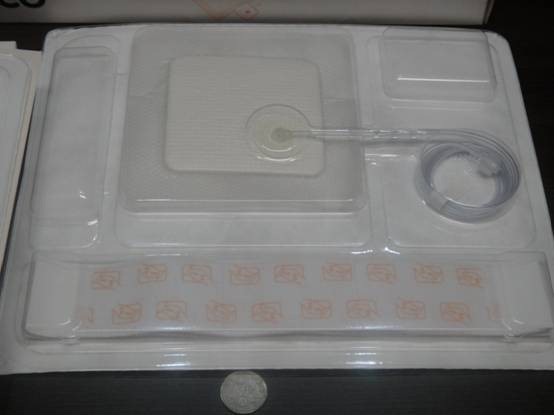 這個機器2個多月前我就已拿到,台灣應該還沒有人看過,因為S&N還在評估要不要進口台灣中,這個小東西其實在我一篇文章中有介紹過,請詳見KCI VAC負壓傷口治療機的近代史,但小小一台機器要價500美元,一旦啟動,就只能使用短短7天,這點讓我一直下不了手,也是因為前幾個月一直很忙,也讓這部落格冷清了很久,今天終於下定決心,拿出相機,要寫下這部落格第一篇的開箱文。首先印入眼中的是好大一個箱子,我旁邊放一個10塊錢硬幣來對照,用尺量一量,約51*39*5cm,從外觀可知,其內含兩塊敷料,一個負壓機器,五片透明薄膜及兩顆電池,敷料的SIZE是15*15公分